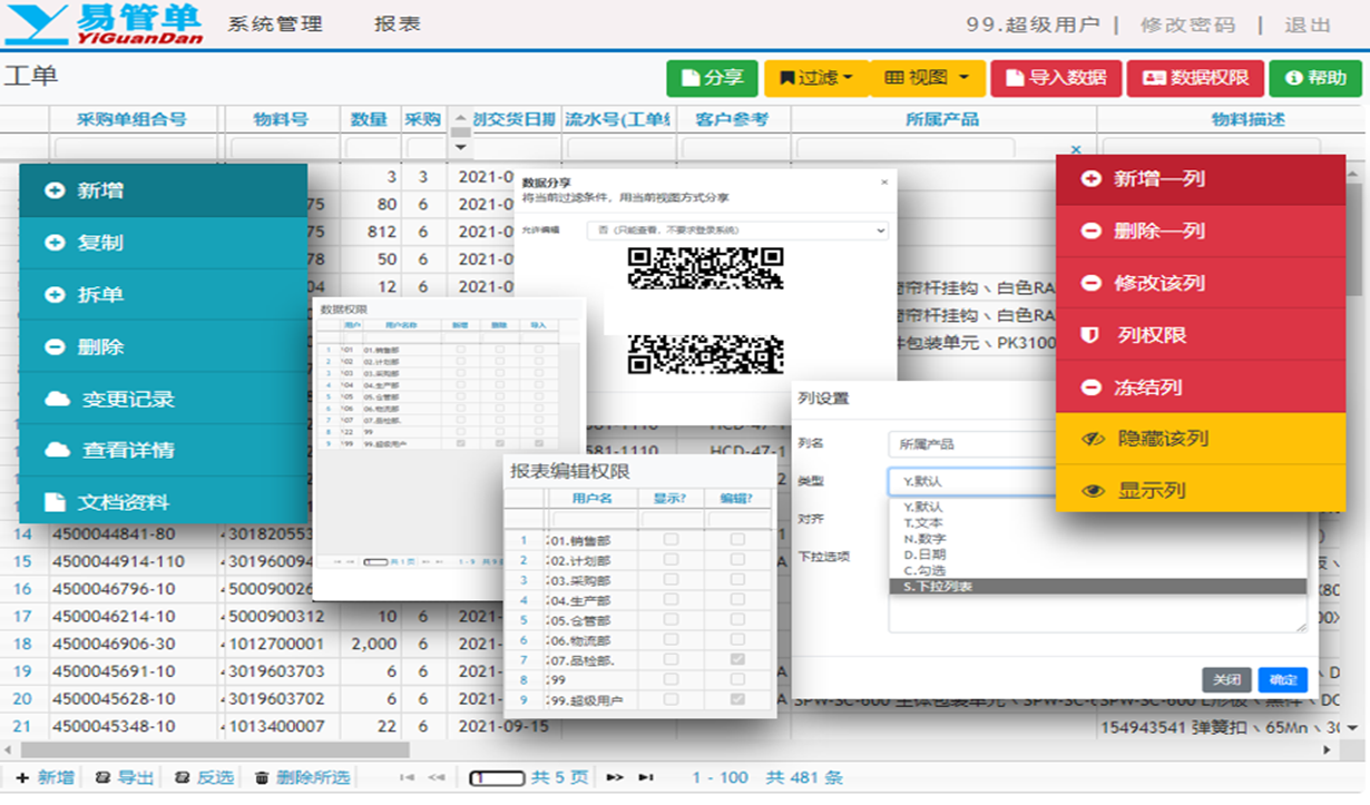 权限控制细致却简易; 报表列排列随心定义,随意切换。